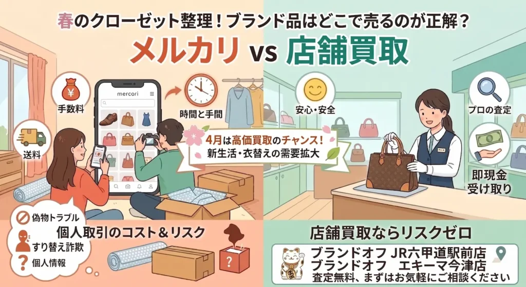 この記事では、メルカリやヤフオクで売る場合と店舗買取を利用する場合を具体的に比較しながら、4月という時期にブランド品を手放すメリットについてもお伝えします。